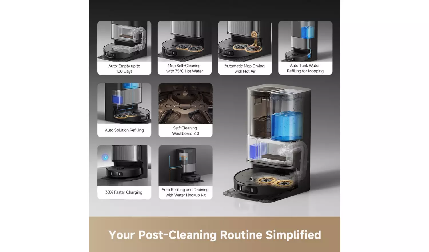 Po končanem čiščenju se robot samodejno vrne v postajo, kjer poteka praznjenje prahu, pranje in sušenje mop-krp, polnjenje in/ali izpraznitev vodnih rezervoarjev — kar pomeni resnično minimalno vzdrževanje s strani uporabnika.
